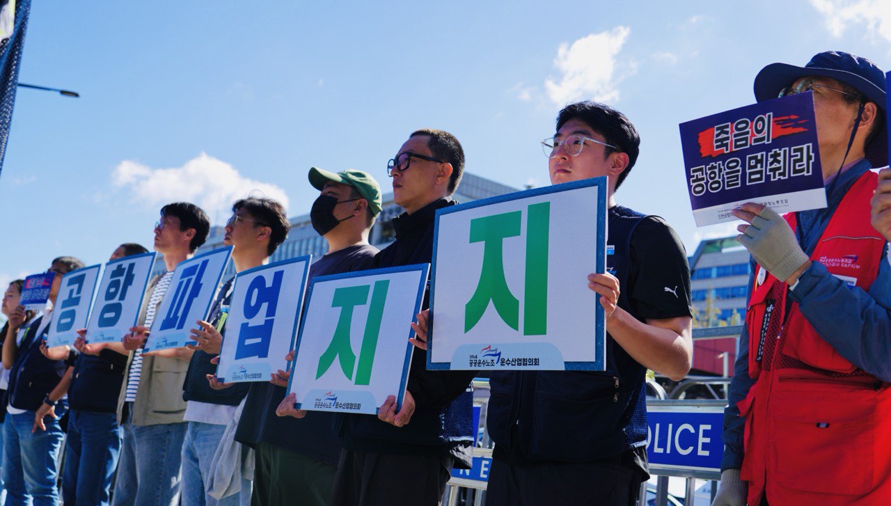 전국공항 총파업 지지 운수노동자 기자회견이 열렸습니다. 10월 16일 오전 11시, 용산 대통령실 앞에서 진행됐습니다. 공공운수노조 운수산업협의회가 주최했습니다. 박정훈 부위원장 취지 발언, 권수정 항공연대협의회 의장 등 연대 발언, 정안석 인천공항지부 지부장 결의 발언, 퍼포먼스가 이어졌습니다. 인천공항 자회사 노동자들이 10월 1일 무기한 파업을 벌였습니다. 추석 연휴 전면 파업 후, 10월 13일 간부 파업과 준법 투쟁 중입니다. 10월 25일 재파업 예고했습니다. 공항공사들의 무책임한 교섭 태도로 파업이 장기화됐습니다. 저임금·과로·인력 부족 문제를 해결하라며, 시민 안전을 위한 투쟁을 지지했습니다. Nationwide airport general strike support press conference held. October 16, 11 AM, Yongsan Presidential Office front. Hosted by Public Transport Union Transport Sector Council. Theme remarks by VP Park Jung-hoon, solidarity from Aviation Alliance Chair Kwon Soo-jung, others; resolution by Incheon Airport Branch Chief Jung An-seok; performance. Incheon Airport subsidiaries launched indefinite strike October 1. Followed Chuseok full strike, October 13 cadre strike and compliance struggle. Warned re-strike October 25. Airports' irresponsible negotiations prolong strike. Demanded fix low wages, overwork, staffing shortages; supported fight for public safety. #공항파업 #총파업지지 #인천공항
