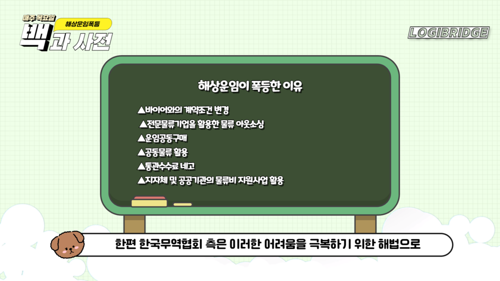 한편 한국무역협회 측은 이러한 어려움을 극복하기 위한 해법으로 ▲바이어와의 계약조건 변경 ▲전문물류기업을 활용한 물류 아웃소싱 ▲운임공동구매 ▲공동물류 활용 ▲통관수수료 네고 ▲지자체 및 공공기관의 물류비 지원사업 활용 등을 제시했습니다.