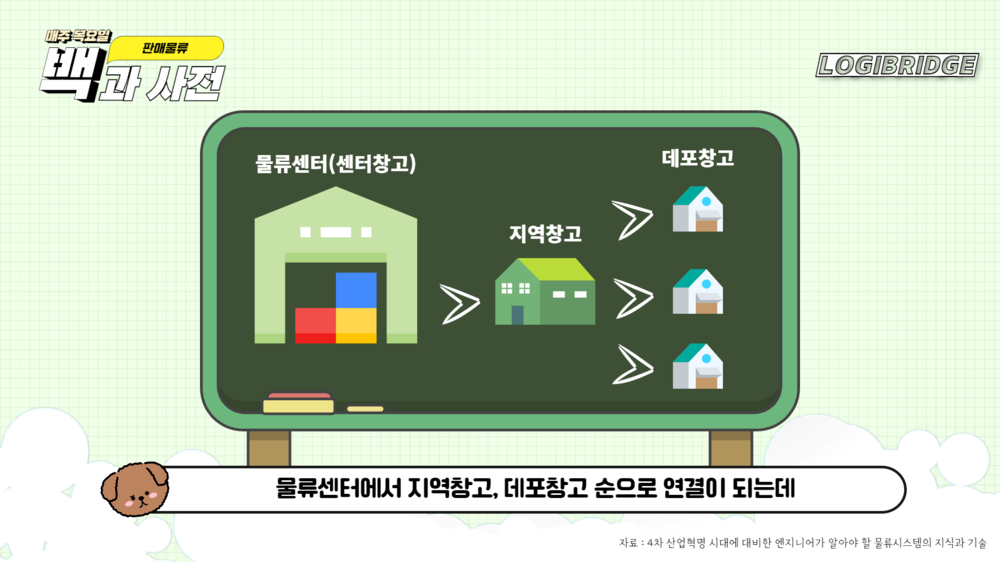 한편 판매물류 영역은 수배송 과정에 따라 물류센터에서 지역창고, 데포창고 순으로 연결이 되는데, 센터창고는 공장과 가깝거나 물류기점이 되는 장소에 설치가 됩니다.