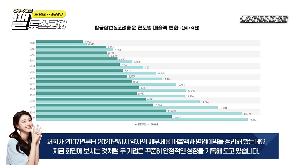 지금 화면에 보시는 것처럼 두 기업은 꾸준히 안정적인 성장을 기록해 오고 있습니다.