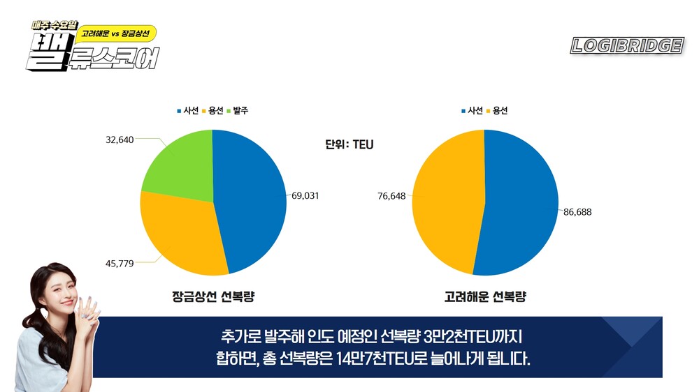 고려해운은 사선 8만6천TEU, 용선 7만6천TEU 규모로, 총 선복량은 16만3천TEU 규모입니다.