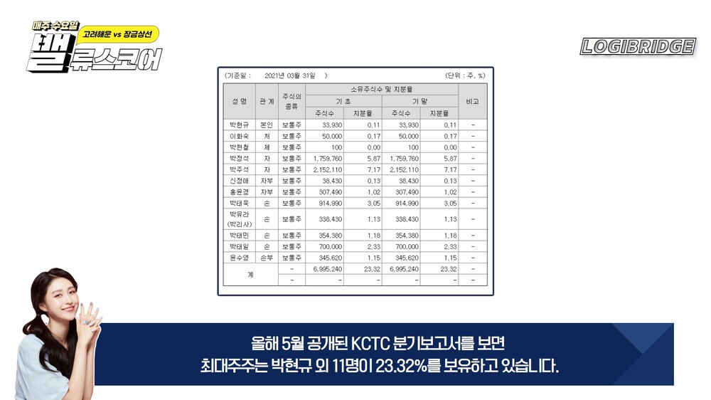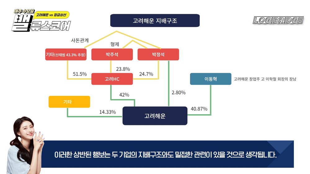 고려해운은 고려HC가 지분 42%를 창업주의 장남인 이동혁 회장이 40.87%의 지분을 쥐고 있습니다.