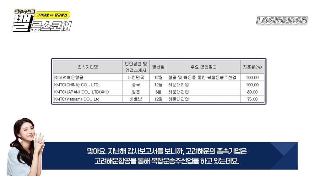 김 : 맞아요. 지난해 감사보고서를 보니까, 고려해운의 종속기업은 고려해운항공을 통해 복합운송주선업을 하고 있는데요. 또한 중국과 일본, 베트남에서 해운대리점사업을 진행하고 있습니다.