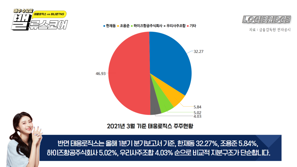 반면 태웅로직스는 올해 1분기 분기보고서 기준, 한재동 32.27%, 조용준 5.84%, 하이즈항공주식회사 5.02%, 우리사주조합 4.03% 순으로 비교적 지분구조가 단순합니다.
