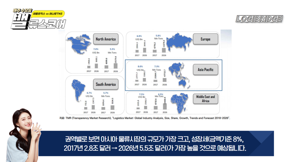 권역별로 보면 아시아 물류시장의 규모가 가장 크고, 성장세(금액기준 8%, 2017년 2.8조 달러 → 2026년 5.5조 달러)가 가장 높을 것으로 예상됩니다.
