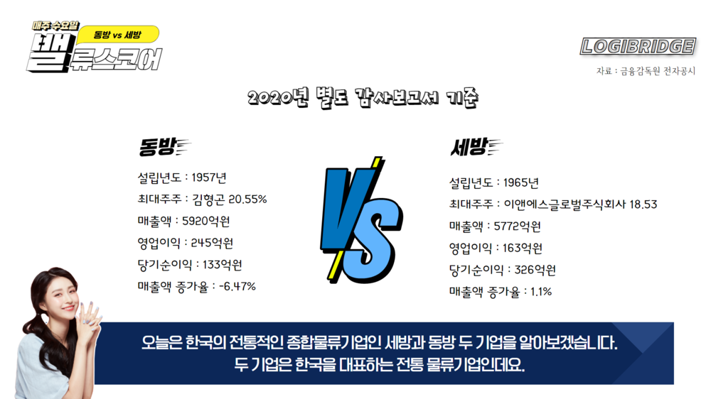 김 : 오늘은 한국의 전통적인 종합물류기업인 세방과 동방 두 기업을 알아보겠습니다.