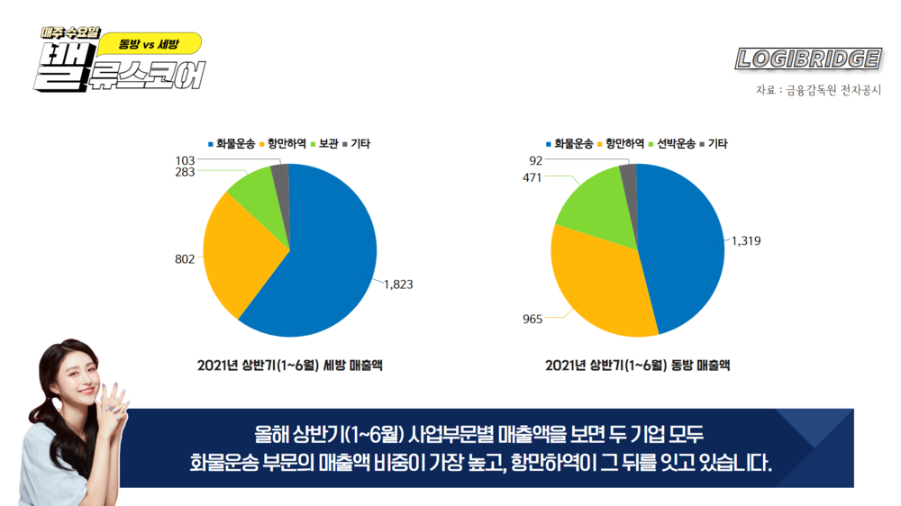 올해 상반기(1~6월) 사업부문별 매출액을 보면 두 기업 모두 화물운송 부문의 매출액 비중이 가장 높고, 항만하역이 그 뒤를 잇고 있습니다.