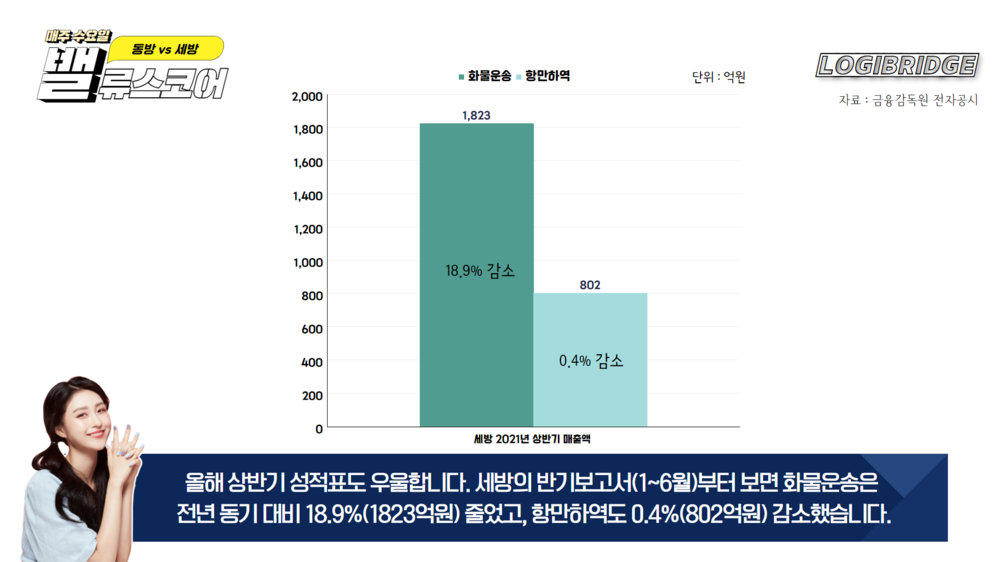 세방의 반기보고서(1~6월)부터 보면 화물운송은 전년 동기 대비 18.9%(1823억원) 줄었고, 항만하역도 0.4%(802억원) 감소했습니다.