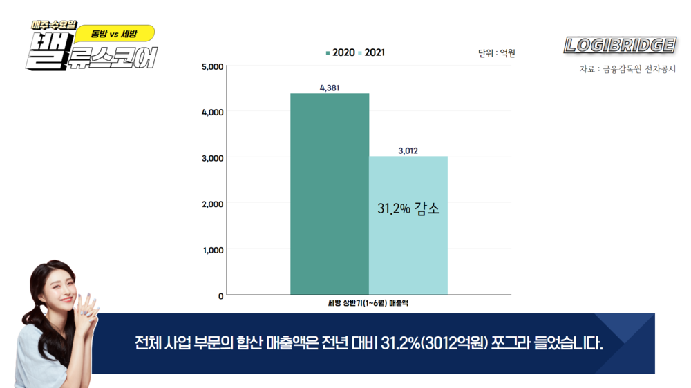 전체 사업 부문의 합산 매출액은 전년 대비 31.2%(3012억원) 쪼그라 들었습니다.
