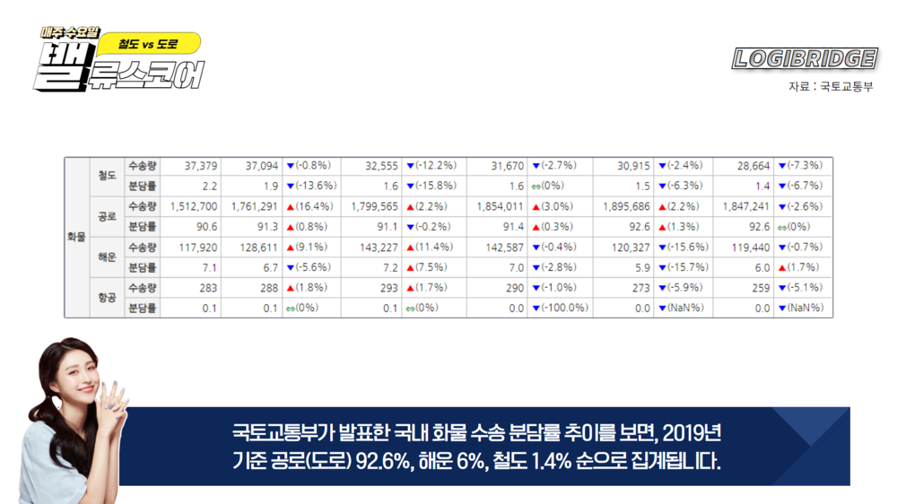 국토교통부가 발표한 국내 화물 수송 분담률 추이를 보면, 2019년 기준 공로(도로) 92.6%, 해운 6%, 철도 1.4% 순으로 집계됩니다.