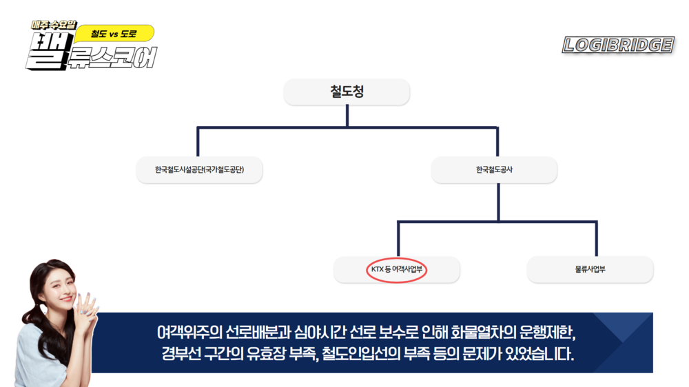 ●김 : 여러 가지 복합적인 이유가 있는데요. 첫째, 철도청이 한국철도공사(코레일)와 한국철도시설공단(공단)으로 분리된 이후, 여객위주의 선로배분과 심야시간 선로 보수로 인해 화물열차의 운행제한, 경부선 구간의 유효장 부족, 철도인입선의 부족 등의 문제가 있었습니다.