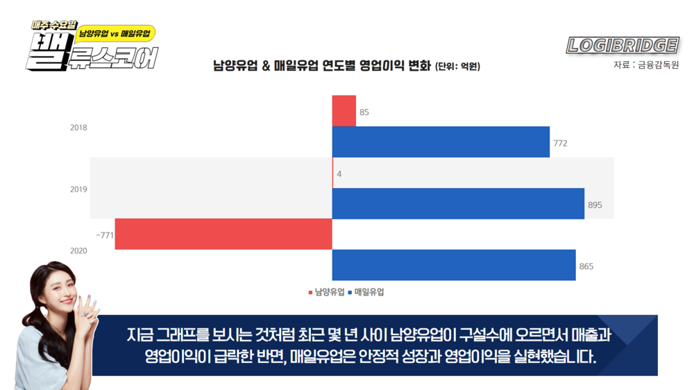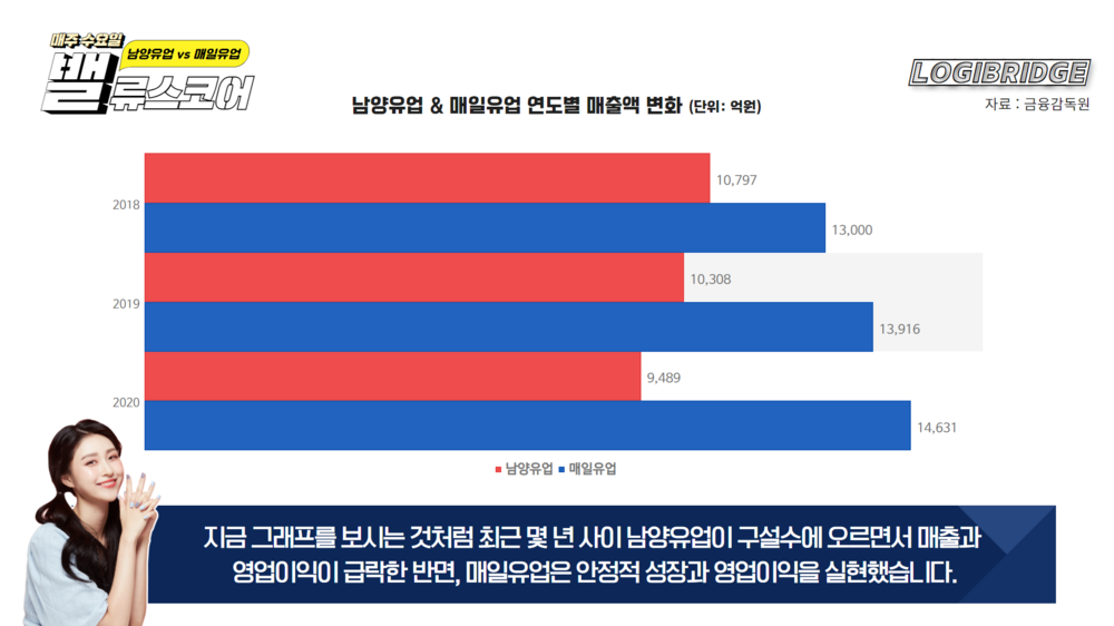 지금 그래프를 보시는 것처럼 최근 몇 년 사이 남양유업이 구설수에 오르면서 매출과 영업이익이 급락한 반면, 매일유업은 안정적 성장과 영업이익을 실현했습니다.