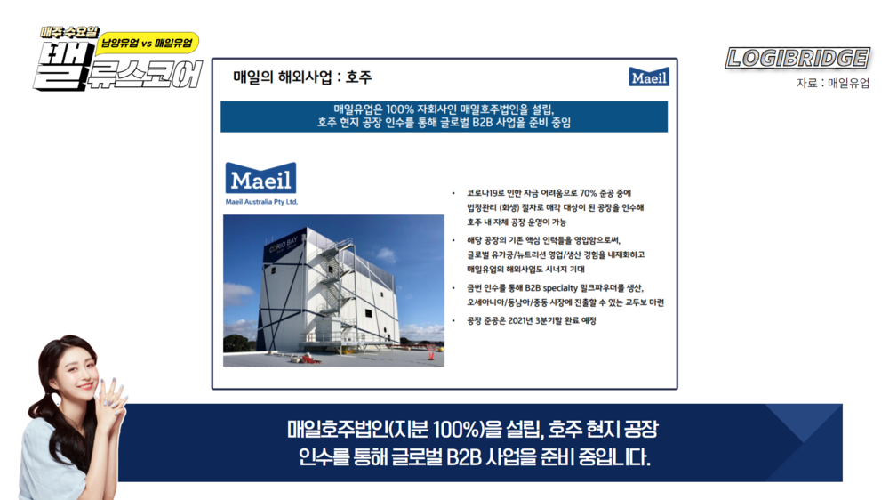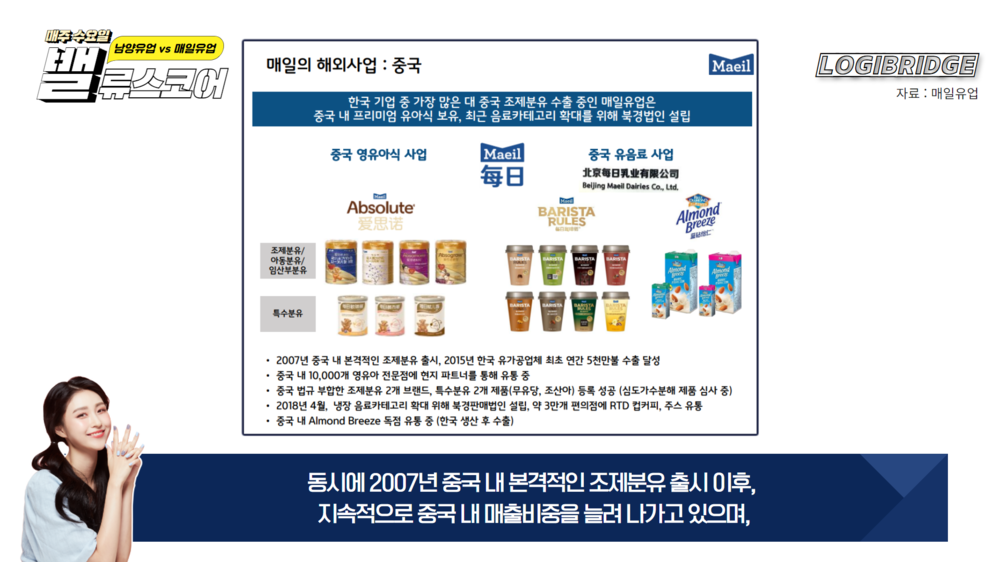 동시에 2007년 중국 내 본격적인 조제분유 출시 이후, 지속적으로 중국 내 매출비중을 늘려 나가고 있으며, 매일호주법인(지분 100%)을 설립, 호주 현지 공장 인수를 통해 글로벌 B2B 사업을 준비 중입니다.