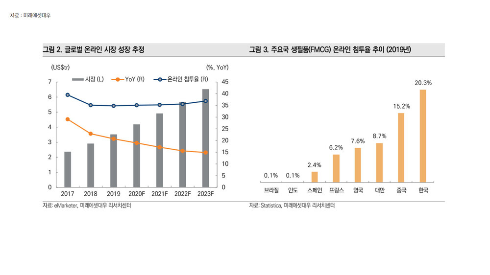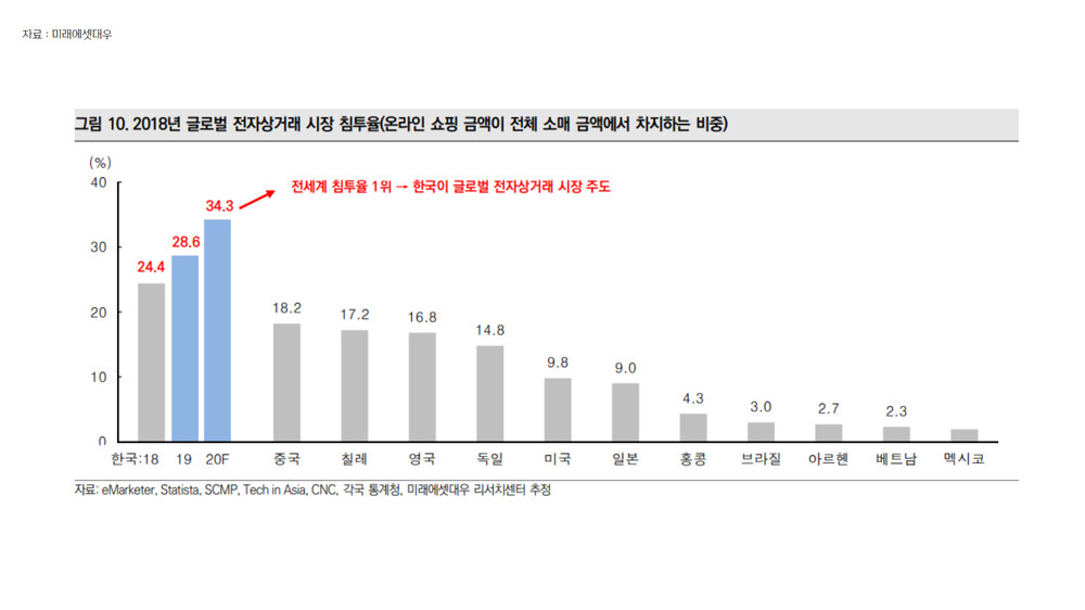 사실 이 부분은 카페24 역시 마찬가지입니다. 미래에셋대우에 따르면 2018년 글로벌 전자상거래 시장 침투율은 한국이 전 세계 1위로 집계됩니다. 말 그대로 한국이 글로벌 전자상거래 시장을 주도하는 주요국 중 한 곳입니다.