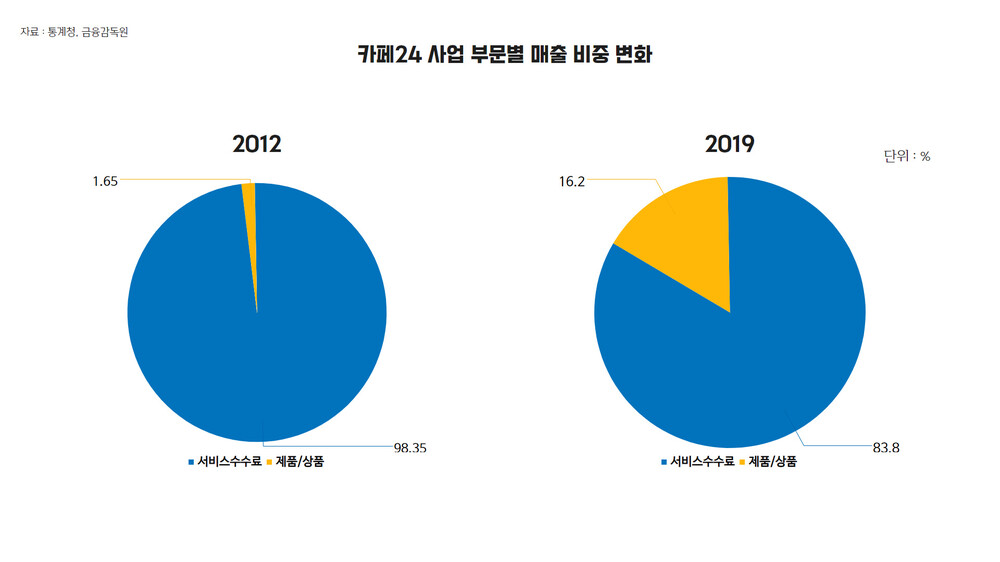 하지만 2019년 상품매출이 57.79%로 늘었고, 용역매출은 39.67%로 비중이 줄었습니다.