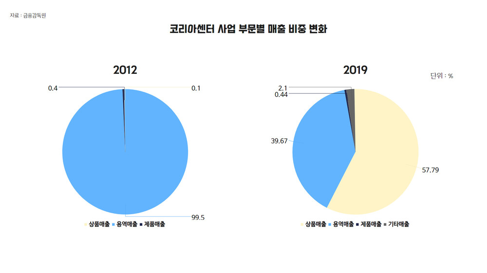 ◆김 : 맞습니다. 오늘은 코리아센터에 초점을 두고 더 깊게 이야기를 해보겠습니다. 코리아센터 2012년 사업 부문별 매출액을 보면 용역매출이 99.5%로 압도적이었습니다.
