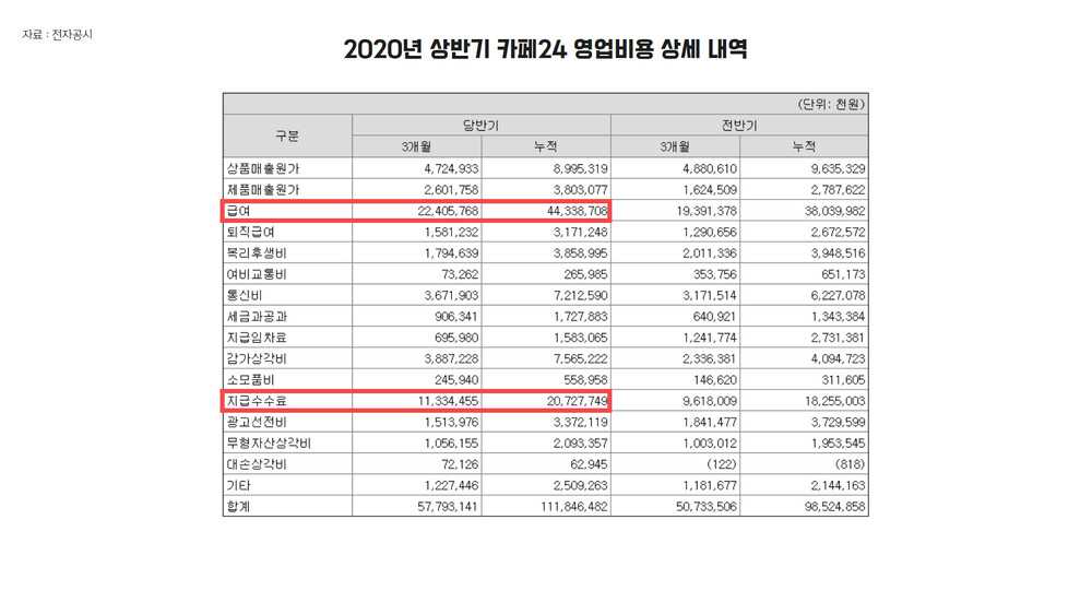 그런데 여기서 재미있는 사실이 있습니다. 올해 상반기 카페24의 영업비용 합계는 1118억원으로, 이 중 급여가 443억원으로 가장 높고, 그다음으로 지급수수료 207억원, 상품매출원가 89억원, 통신비 72억원 등의 순이었습니다.