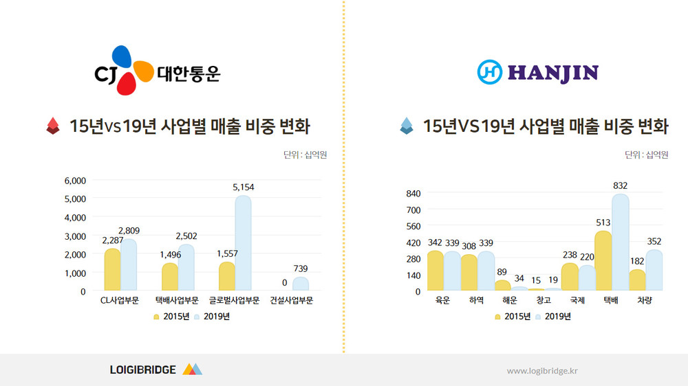 ◇김 : 네 그러면 다음으로 2015년 대비 2019년 매출 비중 변화를 살펴보겠습니다. 한진은 육운 하역 해운 창고 국제 택배 차량으로 구분이 되는데, 택배가 크게 늘었습니다. 2015년 5130억원에서 2019년 8320억원으로. 육운 하역 등은 소폭 상승, 해운은 소폭 감소했고요. 반면 차량은 종합적으로 상승세가 있었다. 종합적으로 매출 전반이 증가했다.