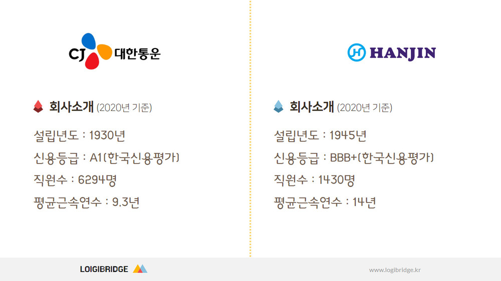◇김 : 예를 들면 업종별 리딩기업 두 곳을 선정해서 양사 1, 2위 기업을 분석 비교하는 코너죠? 저희가 오늘 준비한 기업은 종합물류기업 CJ대한통운과 한진입니다. 한진은 한국을 대표하는 종합물류기업으로 이미 유명했고 CJ는 CJGLS와 대한통운이 합병하면서 명실상부 한국 종합물류기업으로 우뚝 서 있습니다. 두 기업을 소개하려 하는데 양사를 그냥 소개하면 재미가 없죠. 그래서 사전 설정을 했죠? 저는 한진 입장에서 이야기해보려고 하고요.