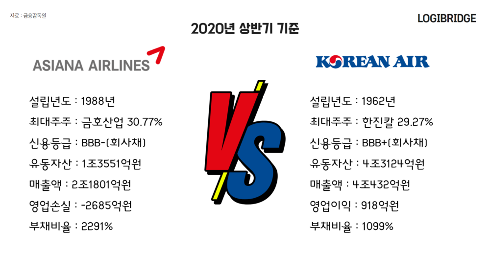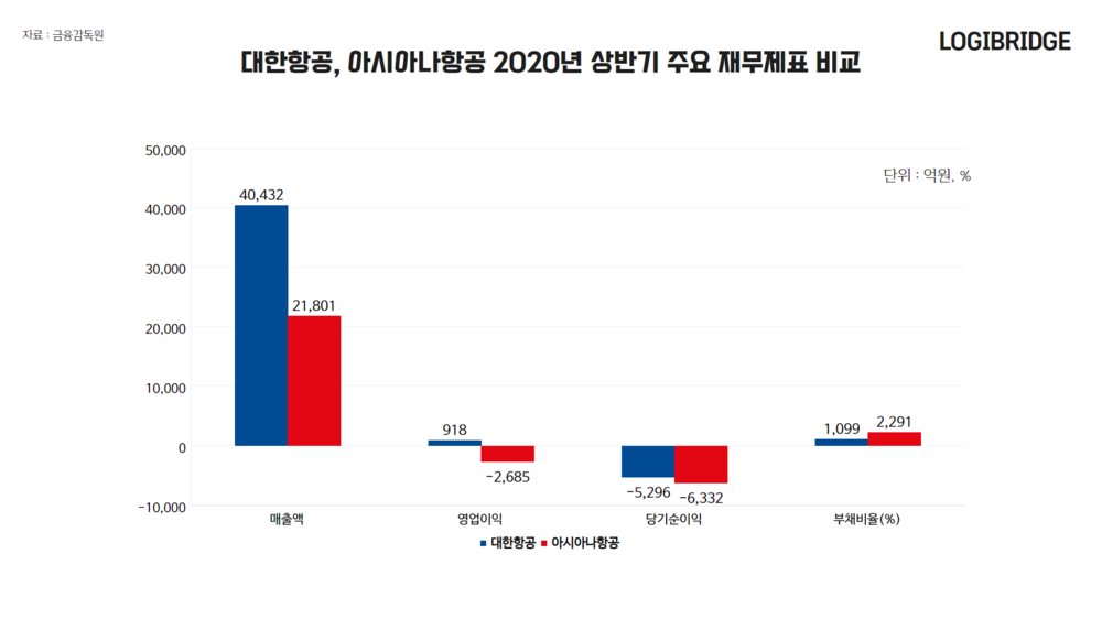 보시는 것처럼 대한항공은 5000억원대의, 아시아나항공은 6000억원대의 당기순손실을 기록했습니다. 부채비율도 빠르게 증가하고 있고요.