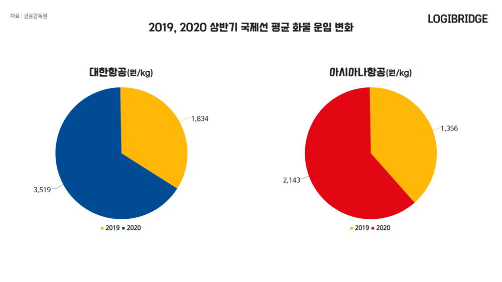 코로나로 전세계 여객기가 운항을 멈추면서, 항공화물 운임도 단기간에 빠르게 상승하는 모습입니다. 그래프에 보시는 것처럼 작년 대비 올해 상반기 국제선 평균 화물 운임은 대한항공이 91.8%, 아시아나항공이 58% 늘었습니다.