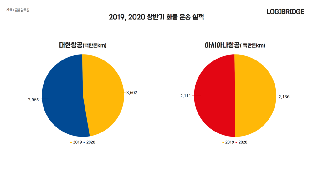 반면 아시아나항공은 대한항공에 비해 시장 변화 대응에 더뎌, 화물 운송 실적은 전년 동기에 비해 다소 감소했습니다.