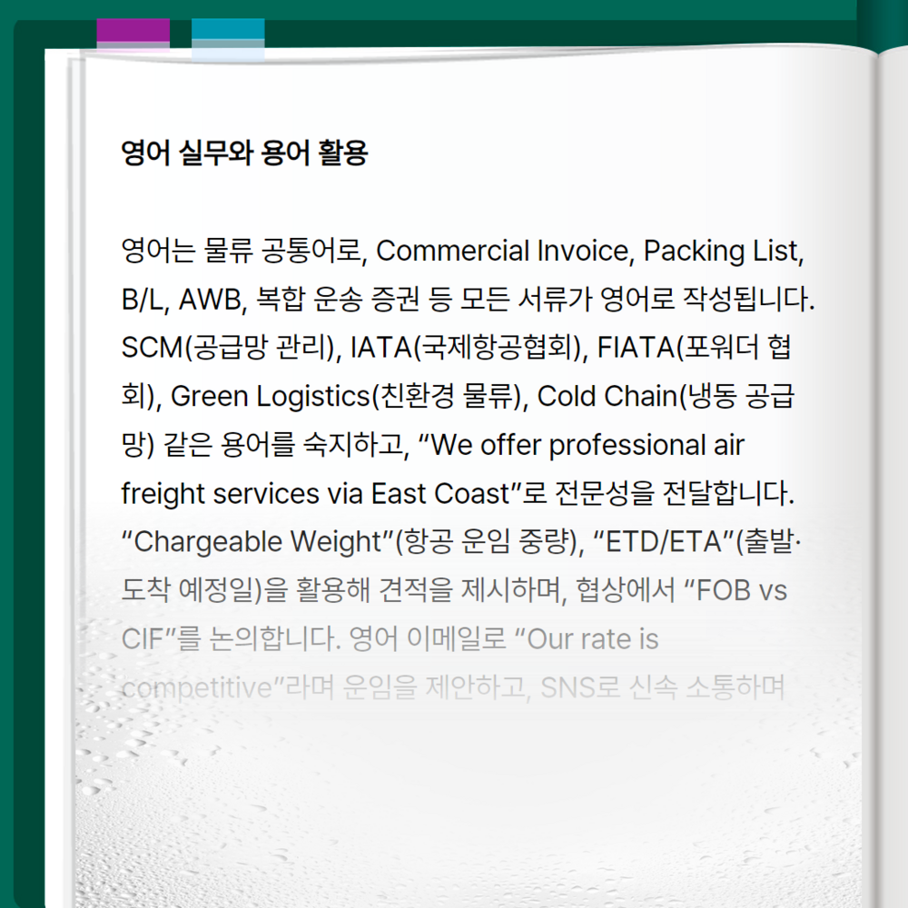 영어는 물류 공통어로, Commercial Invoice, Packing List, B/L, AWB, 복합 운송 증권 등 모든 서류가 영어로 작성됩니다. SCM(공급망 관리), IATA(국제항공협회), FIATA(포워더 협회), Green Logistics(친환경 물류), Cold Chain(냉동 공급망) 같은 용어를 숙지하고, “We offer professional air freight services via East Coast”로 전문성을 전달합니다. “Chargeable Weight”(항공 운임 중량), “ETD/ETA”(출발·도착 예정일)을 활용해 견적을 제시하며, 협상에서 “FOB vs CIF”를 논의합니다. 영어 이메일로 “Our rate is competitive”라며 운임을 제안하고, SNS로 신속 소통하며 화주와 신뢰를 쌓습니다.