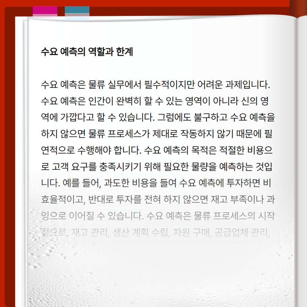 수요 예측은 물류 실무에서 필수적이지만 어려운 과제입니다. 수요 예측은 인간이 완벽히 할 수 있는 영역이 아니라 신의 영역에 가깝다고 할 수 있습니다. 그럼에도 불구하고 수요 예측을 하지 않으면 물류 프로세스가 제대로 작동하지 않기 때문에 필연적으로 수행해야 합니다. 수요 예측의 목적은 적절한 비용으로 고객 요구를 충족시키기 위해 필요한 물량을 예측하는 것입니다. 예를 들어, 과도한 비용을 들여 수요 예측에 투자하면 비효율적이고, 반대로 투자를 전혀 하지 않으면 재고 부족이나 과잉으로 이어질 수 있습니다. 수요 예측은 물류 프로세스의 시작점으로, 재고 관리, 생산 계획 수립, 자원 구매, 공급업체 관리, 주문 실행, 수송 관리, 고객 서비스까지 이어지는 전체 사이클의 기초가 됩니다. 하지만 수요 예측은 본질적으로 틀릴 가능성이 높습니다. 예를 들어, 과거 데이터를 기반으로 예측하더라도