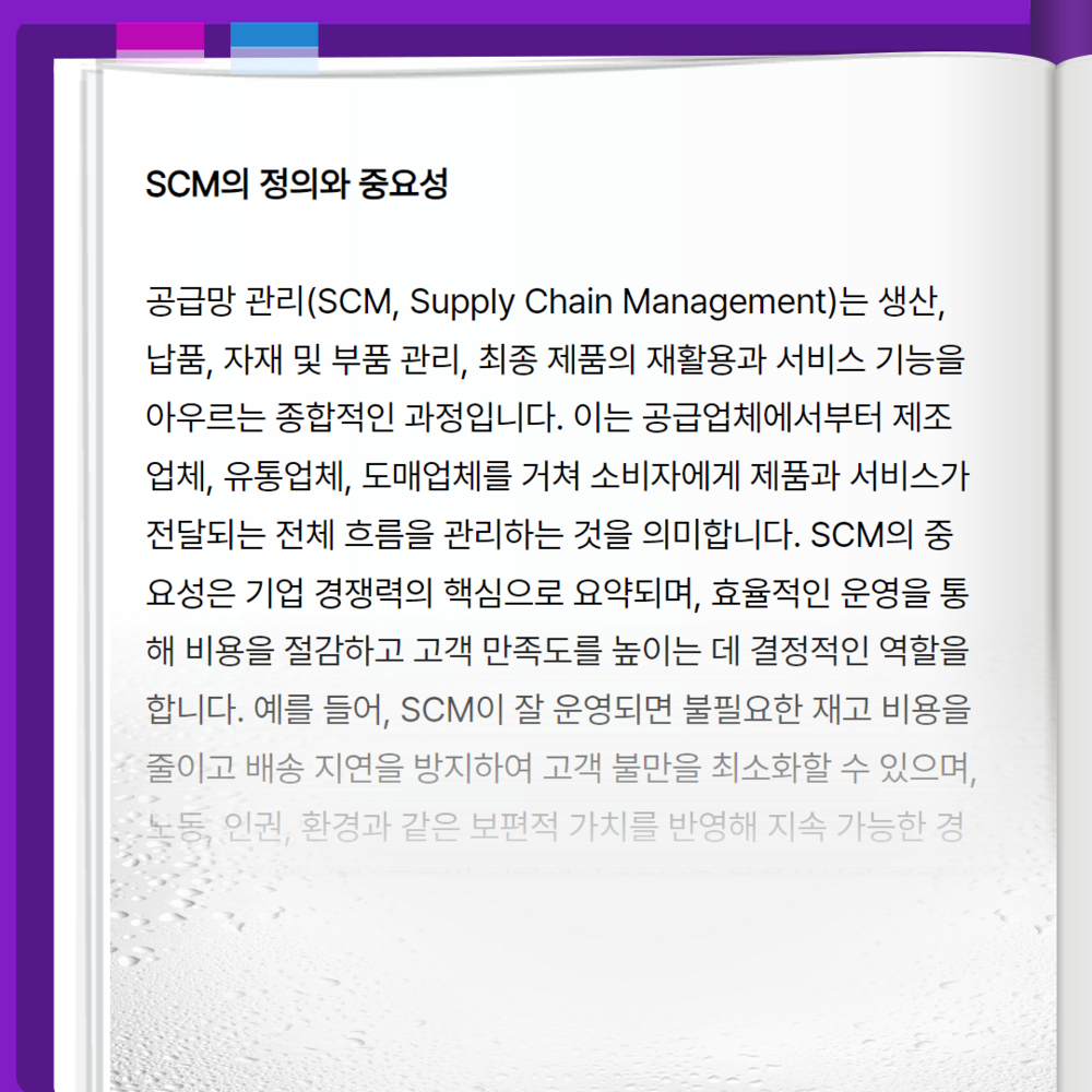 공급망 관리(SCM, Supply Chain Management)는 생산, 납품, 자재 및 부품 관리, 최종 제품의 재활용과 서비스 기능을 아우르는 종합적인 과정입니다. 이는 공급업체에서부터 제조업체, 유통업체, 도매업체를 거쳐 소비자에게 제품과 서비스가 전달되는 전체 흐름을 관리하는 것을 의미합니다. SCM의 중요성은 기업 경쟁력의 핵심으로 요약되며, 효율적인 운영을 통해 비용을 절감하고 고객 만족도를 높이는 데 결정적인 역할을 합니다. 예를 들어, SCM이 잘 운영되면 불필요한 재고 비용을 줄이고 배송 지연을 방지하여 고객 불만을 최소화할 수 있으며, 노동, 인권, 환경과 같은 보편적 가치를 반영해 지속 가능한 경영을 지원합니다. 글로벌 시장에서 SCM은 불확실성과 위기에 대응하는 필수 도구로, 단순한 물류 관리 이상의 전략적 가치를 제공하며 기업의 생존과 성장에 기여합니다.
