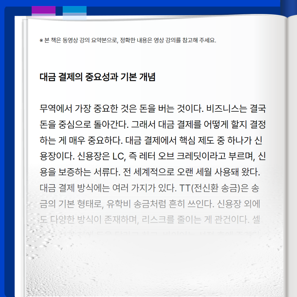 무역에서 가장 중요한 것은 돈을 버는 것이다. 비즈니스는 결국 돈을 중심으로 돌아간다. 그래서 대금 결제를 어떻게 할지 결정하는 게 매우 중요하다. 대금 결제에서 핵심 제도 중 하나가 신용장이다. 신용장은 LC, 즉 레터 오브 크레딧이라고 부르며, 신용을 보증하는 서류다. 전 세계적으로 오랜 세월 사용돼 왔다. 대금 결제 방식에는 여러 가지가 있다. TT(전신환 송금)은 송금의 기본 형태로, 유학비 송금처럼 흔히 쓰인다. 신용장 외에도 다양한 방식이 존재하며, 리스크를 줄이는 게 관건이다. 셀러는 선적 전에 돈을 달라고 하고, 바이어는 선적 후에 주겠다고 한다. 중간에서 만날 수는 없으니, 국내 거래와 달리 대응 시기가 복잡하다. 돈을 주는 일은 간단해 보이지만, 실제로는