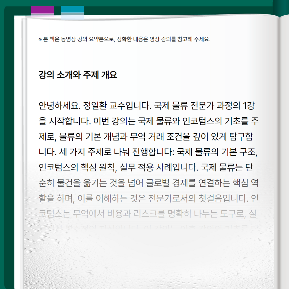 안녕하세요. 정일환 교수입니다. 국제 물류 전문가 과정의 1강을 시작합니다. 이번 강의는 국제 물류와 인코텀스의 기초를 주제로, 물류의 기본 개념과 무역 거래 조건을 깊이 있게 탐구합니다. 세 가지 주제로 나눠 진행합니다: 국제 물류의 기본 구조, 인코텀스의 핵심 원칙, 실무 적용 사례입니다. 국제 물류는 단순히 물건을 옮기는 것을 넘어 글로벌 경제를 연결하는 핵심 역할을 하며, 이를 이해하는 것은 전문가로서의 첫걸음입니다. 인코텀스는 무역에서 비용과 리스크를 명확히 나누는 도구로, 실무에서 필수적인 지식입니다. 이 강의는 이후 강의의 기초를 다지는 데 초점을 맞췄습니다.