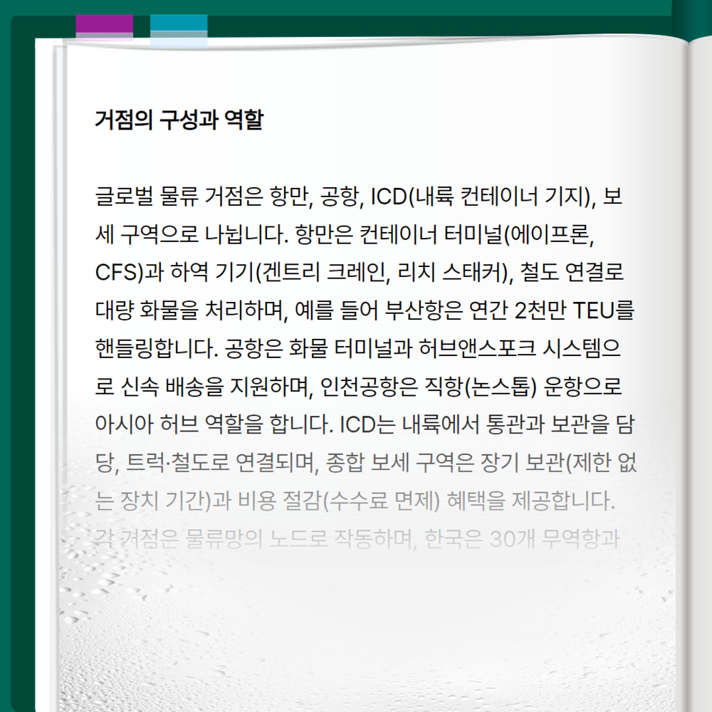 글로벌 물류 거점은 항만, 공항, ICD(내륙 컨테이너 기지), 보세 구역으로 나뉩니다. 항만은 컨테이너 터미널(에이프론, CFS)과 하역 기기(겐트리 크레인, 리치 스태커), 철도 연결로 대량 화물을 처리하며, 예를 들어 부산항은 연간 2천만 TEU를 핸들링합니다. 공항은 화물 터미널과 허브앤스포크 시스템으로 신속 배송을 지원하며, 인천공항은 직항(논스톱) 운항으로 아시아 허브 역할을 합니다. ICD는 내륙에서 통관과 보관을 담당, 트럭·철도로 연결되며, 종합 보세 구역은 장기 보관(제한 없는 장치 기간)과 비용 절감(수수료 면제) 혜택을 제공합니다. 각 거점은 물류망의 노드로 작동하며, 한국은 30개 무역항과 인천공항을 전략적으로 활용합니다. 이는 물류 흐름을 연결하고 효율성을 높이는 핵심 기반입니다.
