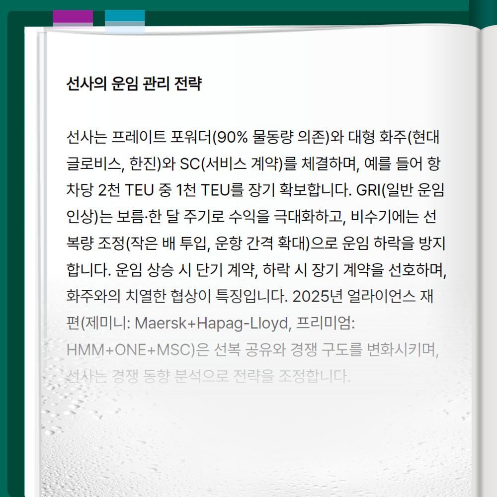 선사는 프레이트 포워더(90% 물동량 의존)와 대형 화주(현대글로비스, 한진)와 SC(서비스 계약)를 체결하며, 예를 들어 항차당 2천 TEU 중 1천 TEU를 장기 확보합니다. GRI(일반 운임 인상)는 보름·한 달 주기로 수익을 극대화하고, 비수기에는 선복량 조정(작은 배 투입, 운항 간격 확대)으로 운임 하락을 방지합니다. 운임 상승 시 단기 계약, 하락 시 장기 계약을 선호하며, 화주와의 치열한 협상이 특징입니다. 2025년 얼라이언스 재편(제미니: Maersk+Hapag-Lloyd, 프리미엄: HMM+ONE+MSC)은 선복 공유와 경쟁 구도를 변화시키며, 선사는 경쟁 동향 분석으로 전략을 조정합니다.
