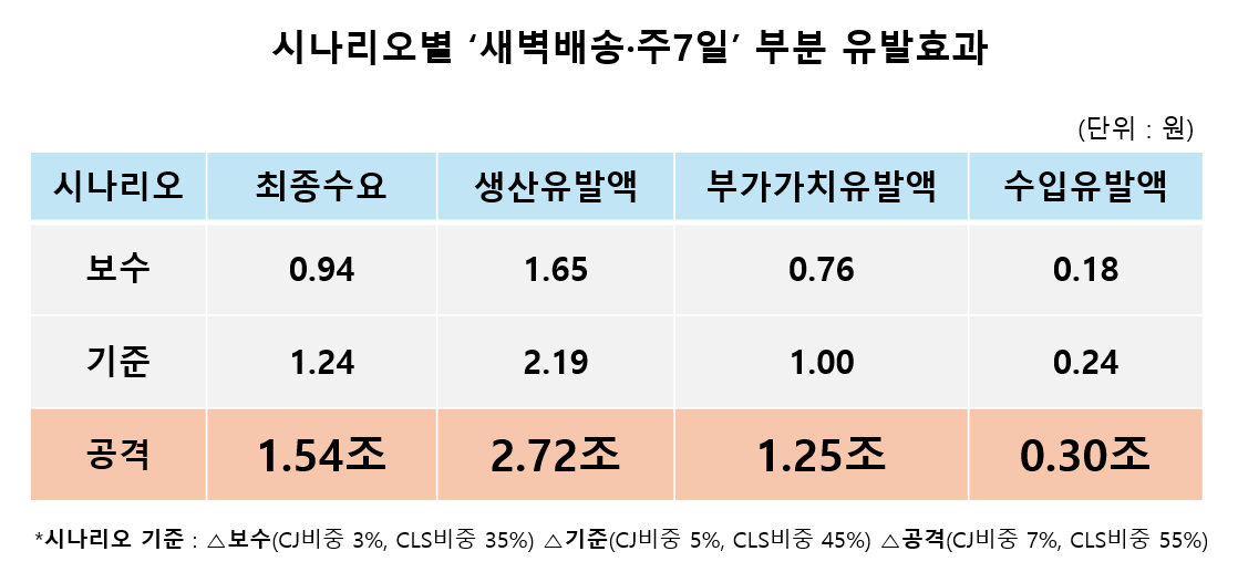 연구에 따르면 새벽과 주7일 배송 서비스의 거시적 효과는 최대 최종수요 1조 5천억 원, 생산유발 2조 7천억 원, 부가가치유발 1조 2천억 원, 취업유발 1만 2천 명, 고용유발 7천 명으로 나타났습니다. 특히 운수 및 보관 분야의 고용 유발 계수는 제조업보다 높아 해당 산업의 위축은 곧 노동시장 위축으로 이어질 수 있다고 분석했는데요. 학회는 이를 생활물류 산업의 숨은 일자리 창출 효과라고 강조했습니다.
