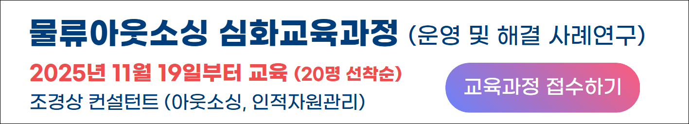 ⦁ 로지브릿지 멤버십 회원사 '한국SCM협회' 소개:물류아웃소싱 운영의 실제 사례와 해결 전략을 다루는 심화교육과정이 11월 19일 서울사이버대학교에서 열립니다. 조경상 컨설턴트가 실무 중심으로 강의하며, 수료증·전문가 자문(2회) 등 실질적인 혜택이 제공됩니다. 선착순 20명, 11월 14일까지 신청 가능합니다. (더 자세히 보기)