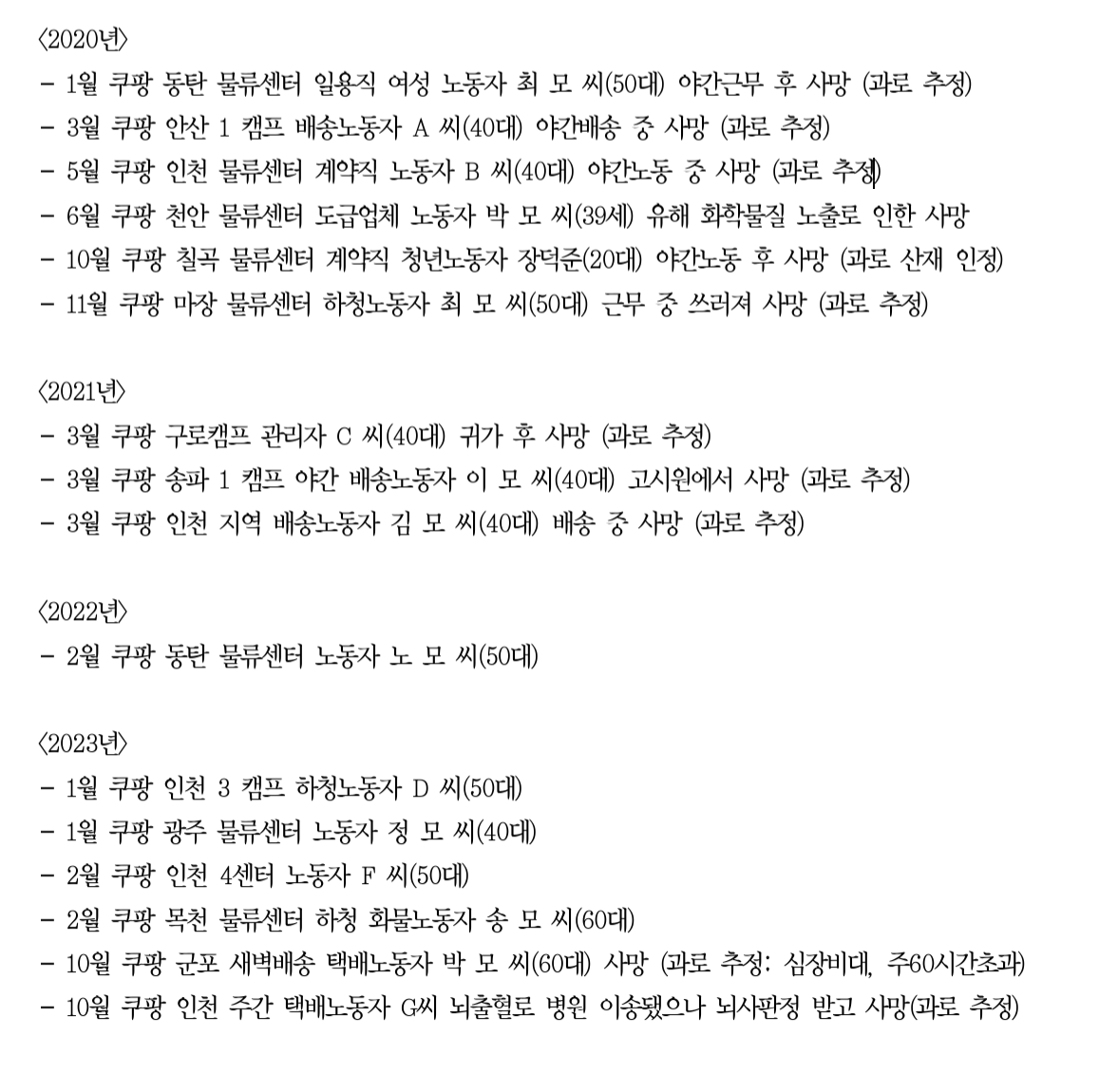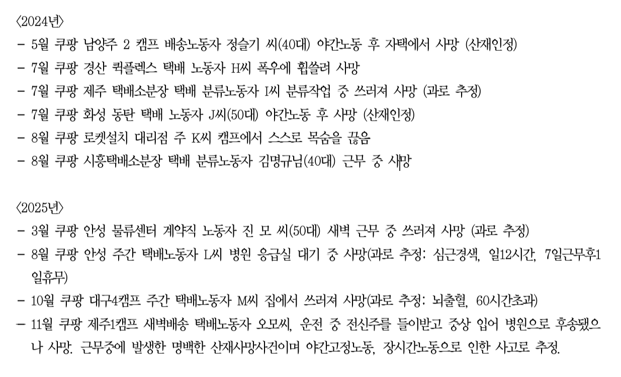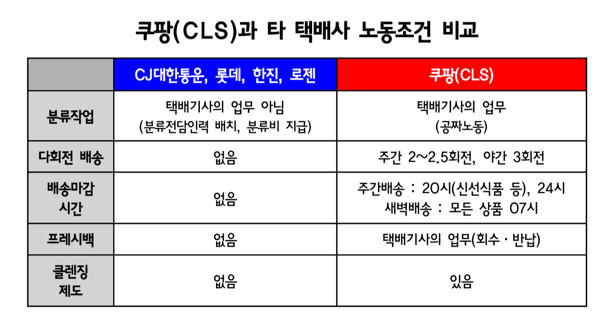 노조는 쿠팡이 과로 문제의 핵심적 책임을 져야 한다고 강조했습니다. 쿠팡은 건당 수수료를 해마다 삭감했고 현재는 초기 금액에서 크게 낮아졌다고 말했습니다. 또한 마감시간을 정해놓고 문자나 전화로 압박을 가하는 관행을 지적하며 노동자를 개처럼 뛰게 만든다고 비판했습니다. 분류작업과 반복배송 등 다양한 업무가 특수고용이라는 이유로 강요되고 있다는 점도 노조는 문제로 제시했습니다. 이 모든 요소가 과로의 원인이라며 쿠팡이 더 이상 책임을 회피해서는 안 된다고 입장을 밝혔습니다. 또 노조는 택배노동자들에게 언론의 프레임이 아닌 노조가 제시하는 과로사 방지 대책에 주목해 달라고 호소했습니다. 생존권과 건강권을 지키기 위한 종합 대안을 검토해 달라며 함께해 줄 것을 요청했습니다.