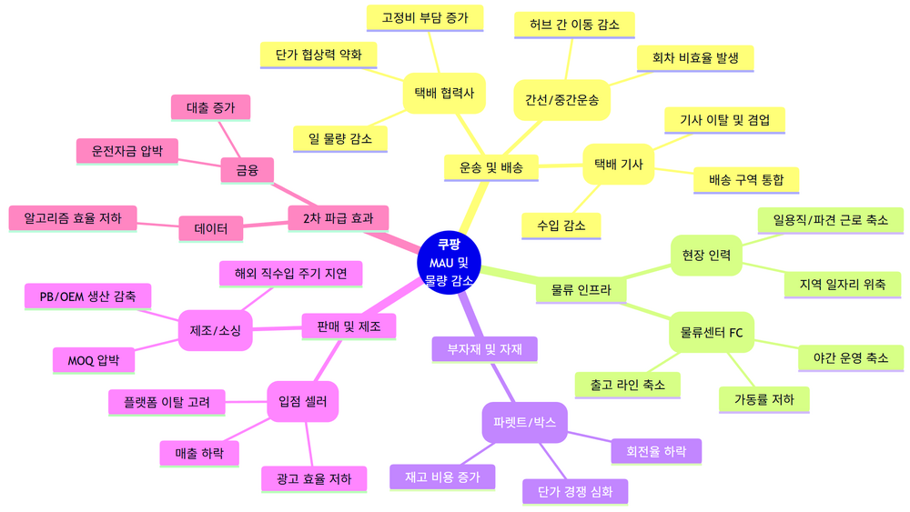 쿠팡은 플랫폼이고, 플랫폼은 공급망의 스위치입니다. 스위치가 내려가면 물류센터의 가동률이 먼저 떨어지고, 사람과 차량이 움직임을 줄이며, 부자재와 포장부터 납품·제조까지 발주가 보수적으로 바뀌고, 셀러의 현금흐름과 채널 전략이 흔들립니다. 이 모든 변화가 같은 방향으로 동시에 움직이기 때문에, 체감은 빠르고 연쇄는 깊게 퍼집니다. 쿠팡 이용자가 감소하면 주문이 줄어드는 것으로 끝나지 않고, 쿠팡을 중심으로 연결된 협력사와 관련 산업의 ‘물량 경제성’이 무너지면서 사람, 차량, 포장, 제조, 자금 흐름까지 연쇄적으로 흔들릴 수 있다는 예측입니다.