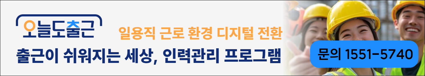 ⦁ 로지브릿지 멤버십 회원사 ‘오늘도 출근’ 소개: ‘오늘도 출근’은 일용직, 단기 근로자, 교대 근무자 등 스케줄 기반 인력 운영에 특화된 솔루션입니다. 근태관리, 전자근로계약서, TBM(작업 전 안전회의) 일지, 급여정산 등 인사·노무관리 전반을 통합 지원하며, 물류센터, 건설현장, 연회장 등 유동 인력이 많은 업종에서 실질적인 운영 효율성과 노무 리스크 절감을 가능하게 합니다. (더 자세히 보기)