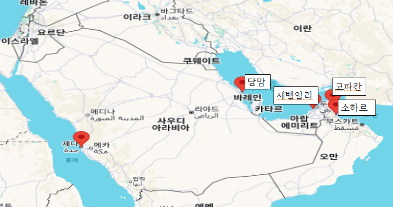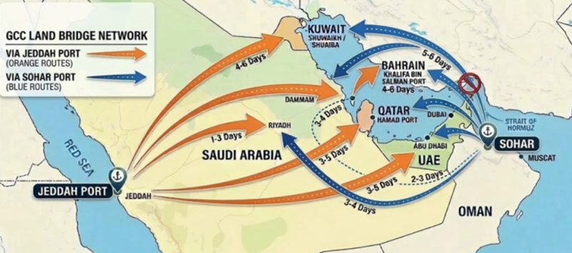 A. 호르무즈 해협 이슈의 영향을 직접 받는 곳은 GCC, 즉 걸프협력회의 국가들입니다. 사우디아라비아, 쿠웨이트, 바레인, 카타르, UAE, 오만, 이렇게 여섯 나라입니다. 이 가운데 주요 항만을 보면 사우디의 제다항과 담맘항, UAE의 제벨알리항과 코르파칸항, 오만의 소하르항이 중요합니다. 현재 물류업계에서 검토하는 루트는 크게 세 가지입니다. 하나는 홍해를 통해 사우디 제다항으로 하역하는 루트입니다. 둘째는 인도 문드라항이나 나바셰바항 등에서 환적한 뒤 홍해를 통해 제다항으로 보내는 루트입니다. 셋째는 UAE 코르파칸항이나 오만 소하르항에 먼저 하역한 뒤, 이후 트럭으로 GCC 국가까지 연결하는 방식입니다. 이른바 랜드 브릿지 서비스입니다.