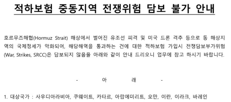 A. 많이들 그렇게 기대하시지만 실제로는 그렇지 않은 경우가 많습니다. 일반적인 ICC(A) 조건의 적하보험에 가입했다고 해서 전쟁위험이 자동으로 담보되는 것은 아닙니다. 전쟁위험을 담보받으려면 협회전쟁약관, 즉 Institute War Clause를 별도로 가입해야 합니다. 그런데 이번 이란 사태 이후에는 보험사들이 GCC 국가로 향하는 화물에 대해 이 특약 인수를 제한하거나 아예 받지 않는 경우가 많습니다. 가입 자체가 현실적으로 어려운 상황입니다. 게다가 설령 협회전쟁약관에 가입되어 있었다고 하더라도, 전쟁으로 인한 운송 지연 때문에 발생한 손해는 적하보험의 담보 대상이 아닌 경우가 많습니다. 이 부분은 실무자들이 특히 유의해야 합니다.