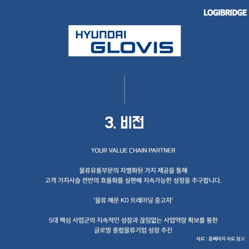 현대글로비스는 GLOBAL과 VISION의 합성어로 세계화 시대에 새로운 비전을 제시하는 글로벌 종합물류유통기업을 뜻합니다.