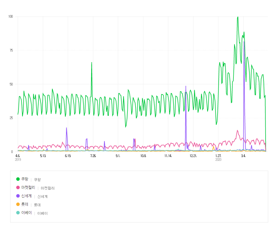 최근 1년간 네이버와 구글의 검색 관심도는 쿠팡이 거의 모든 플랫폼을 압도합니다. 온라인 이커머스를 이야기 할 때 쿠팡을 빼놓지 않는 이유이기도 합니다.