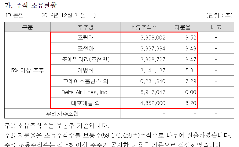 한진칼은 한진그룹 지배구조 정점에 있는 지주회사로 4월 27일 기준, 조원태 진영으로 분류되는 조원태(6.52%), 조현민(6.47%), 이명희(5.31%), 델타항공(14.9%) 측 등과 조현아 진영인 조현아(6.49%), KCGI(19.36%), 반도건설(16.9%) 등으로 갈려 있습니다.