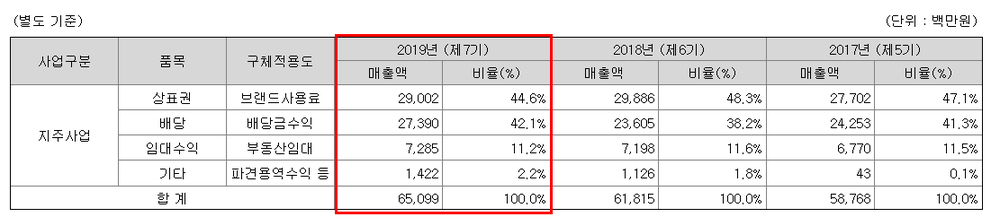 계열회사로부터 배당금수익과 브랜드사용료, 지급수수료를 안정적으로 수취하는 덕분입니다.