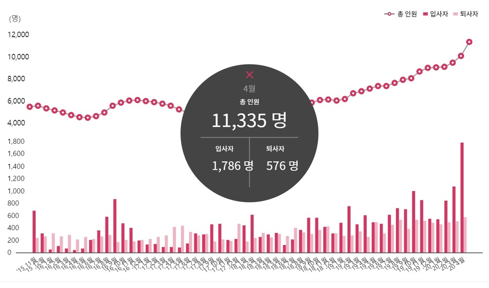 기업정보를 볼 수 있는 '크레딧잡'을 통해 확인한 결과, 올해 4월 기준 쿠팡 입사자는 1786명, 퇴사자는 576명입니다.