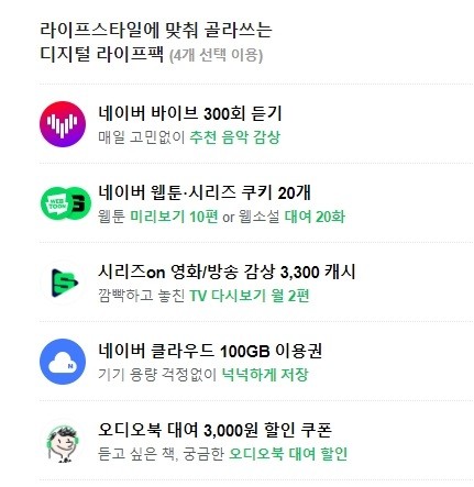 ▲네이버 음악(바이브) 300회 듣기 ▲네이버 쿠키(웹툰·시리즈) 20개 ▲영화/방송 월 2편 다시보기 ▲네이버 클라우드 100GB 이용권 ▲오디오북 3000원 할인 쿠폰입니다.