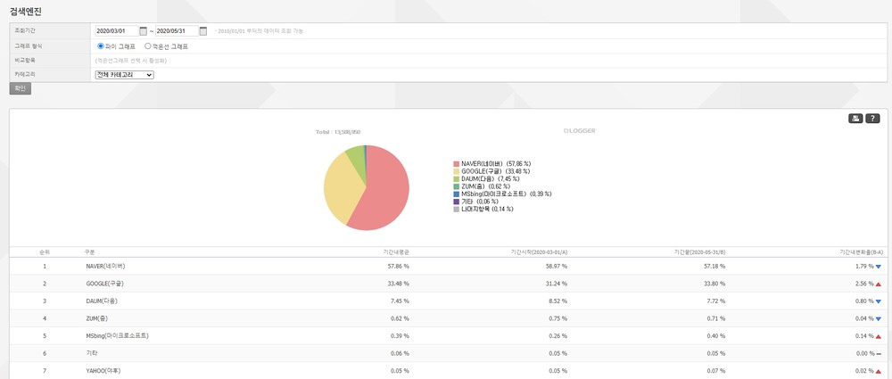 최근 3개월(3월~5월) 간 검색엔진 점유율은 네이버 57.86%, 구글 33.48%, 다음 7.45% 순으로 나타났습니다.