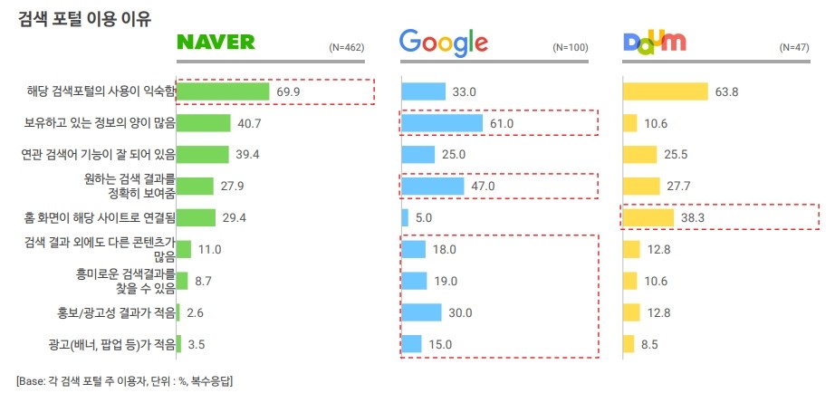 또한 네이버 포털을 이용하는 이유에 대해서 69.9%의 응답자는 '해당 검색포털의 사용이 익숙하기 때문'이라고 응답한 반면, 구글은 '보유하고 있는 정보의 양이 많기 때문'이라는 응답자가 61%로 가장 높았습니다.