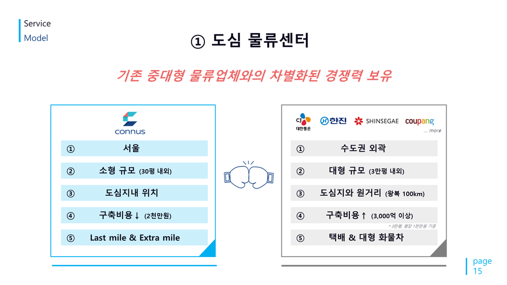 현재 코너스라는 도심 물류 서비스는 재정비 기간에 있고, 외곽에 있는 대형 물류센터와 도심지 내의 코너스를 연결하여 시너지를 내려고 합니다. 고객들이 코너스에 관심을 갖고 문의를 많이 하고 있습니다.