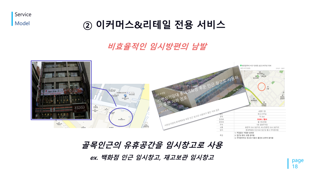 지금 현재, 성수점, 구로점, 논현점 3개점을 운영을 했었습니다. 현재 라스트 딜리버리 서비스라 하면 대부분은 음식 서비스입니다. 이륜차를 이용하고 있습니다. 이륜차를 이용한 배송 서비스는 도심지 내부에서만 일어날 수 있습니다.